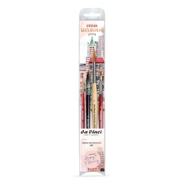 Urban Watercolor olarak tanımlanan seyahat suluboya setleri şu anda çok moda. Çok başarılı yazar ikilisi, May & Berry tarafından tavsiye edilmiş ve kitaptaki eskizlerde kullanılmıştır olan fırçaları Da Vinci bir araya getirdi. Yuvarlak ve düz şekilli başarılı COSMOTOP-SPIN fırçalarına ve CASANEO serisinin şu anda son derece popüler olan yıkama fırçasına ek olarak, bu set ayrıca uzatılmış ok ucuyla en son üretilen DARTANA-SPIN'i de içerir.